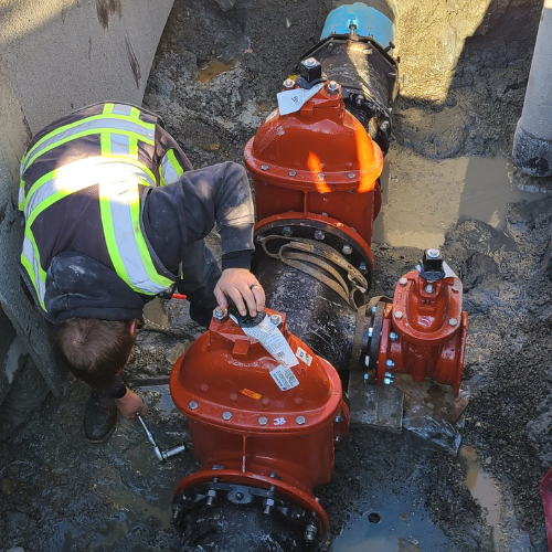 Hot tap for fire line and new fire hydrant Install post indicator valve, sidewalk restora-tion and temp patch asphalt in roadway, fire department test and flush, backfill, cut and trench for new fire line, traffic control as required.